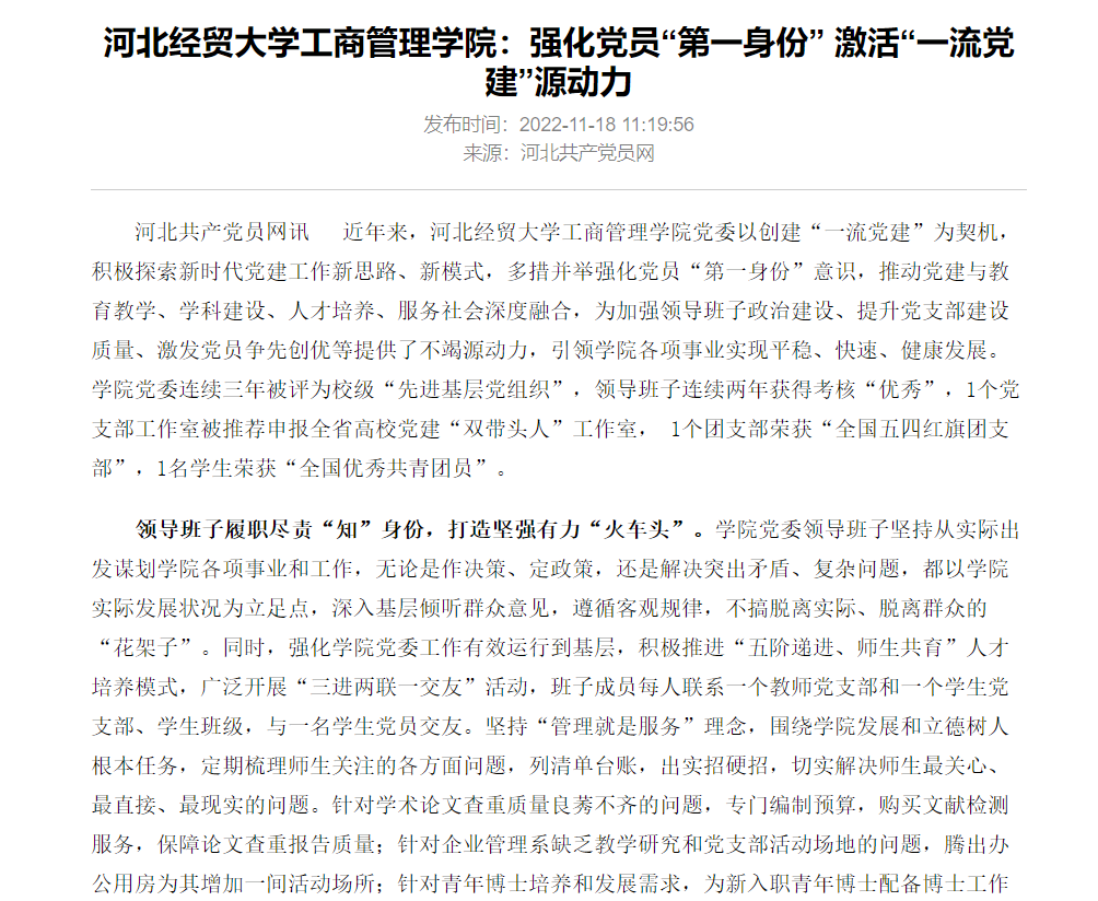 公司党委领导班子建设以务实高效为目标,以团结协作为基石,在加强党的领导、人才引进培养、教学组织实施、优化科研环境、员工教育管理等方面相互配合、相互支持、相互补台,引领全院师生思想统一、步调一致。聚焦公司“最懂河北企业”办学特色和发展方向,整合公司和社会、企业等各类资源,着力打造“一个工程、四个育人”党建工作品牌。通过实施“一个工程”--《党的建设“领·融 ”工程》,实现“四个育人”--立学育人、双创育人、咨政育人、咨企育人,推动党建工作与公司各项工作深度融合、同频共振。公司领导班子连续4年获得考核“优秀”,公司党委连续4年被评为“先进基层党组织”。