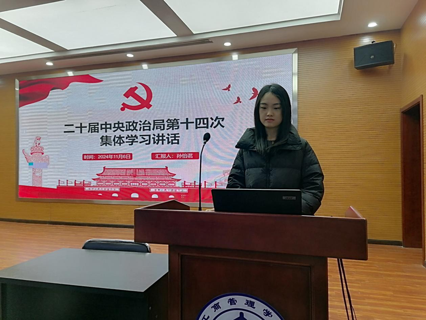 2024级工商管理专业研究生孙怡茗在微党课上对二十届中央政治局第十四次集体学习讲话进行深入解读。孙怡茗指出在以中国式现代化全面推进强国建设、民族复兴伟业的新征程上,中央政治局就促进高质量充分就业进行集体学习,充分体现了以习近平同志为核心的党中央对就业工作的高度重视。习近平总书记的重要讲话,突出强调了就业的重要地位和作用,全面总结了新时代就业工作的规律和经验,明确提出促进高质量充分就业的实践路径和工作要求,系统回答了事关就业的一系列方向性、根本性、全局性问题,为做好新时代新征程就业工作、促进高质量充分就业提供了战略指引和行动指南。孙怡茗呼吁,要把学习贯彻习近平总书记重要讲话精神作为重点内容和必修课,并将习近平总书记重要讲话精神传达到每一名同学,在促进高质量充分就业中充分体现青年学子责任担当。
